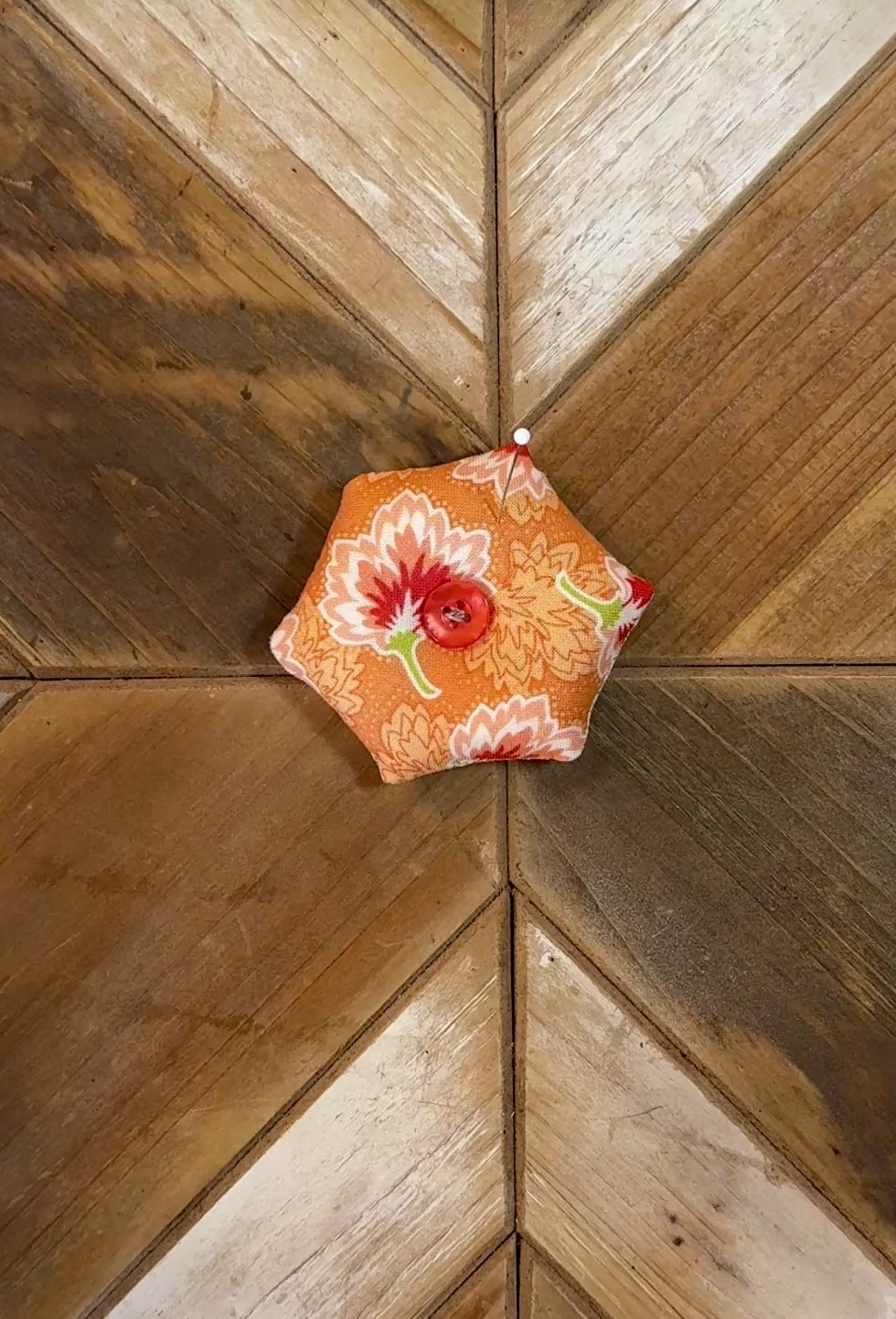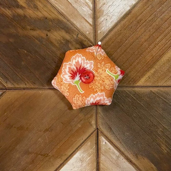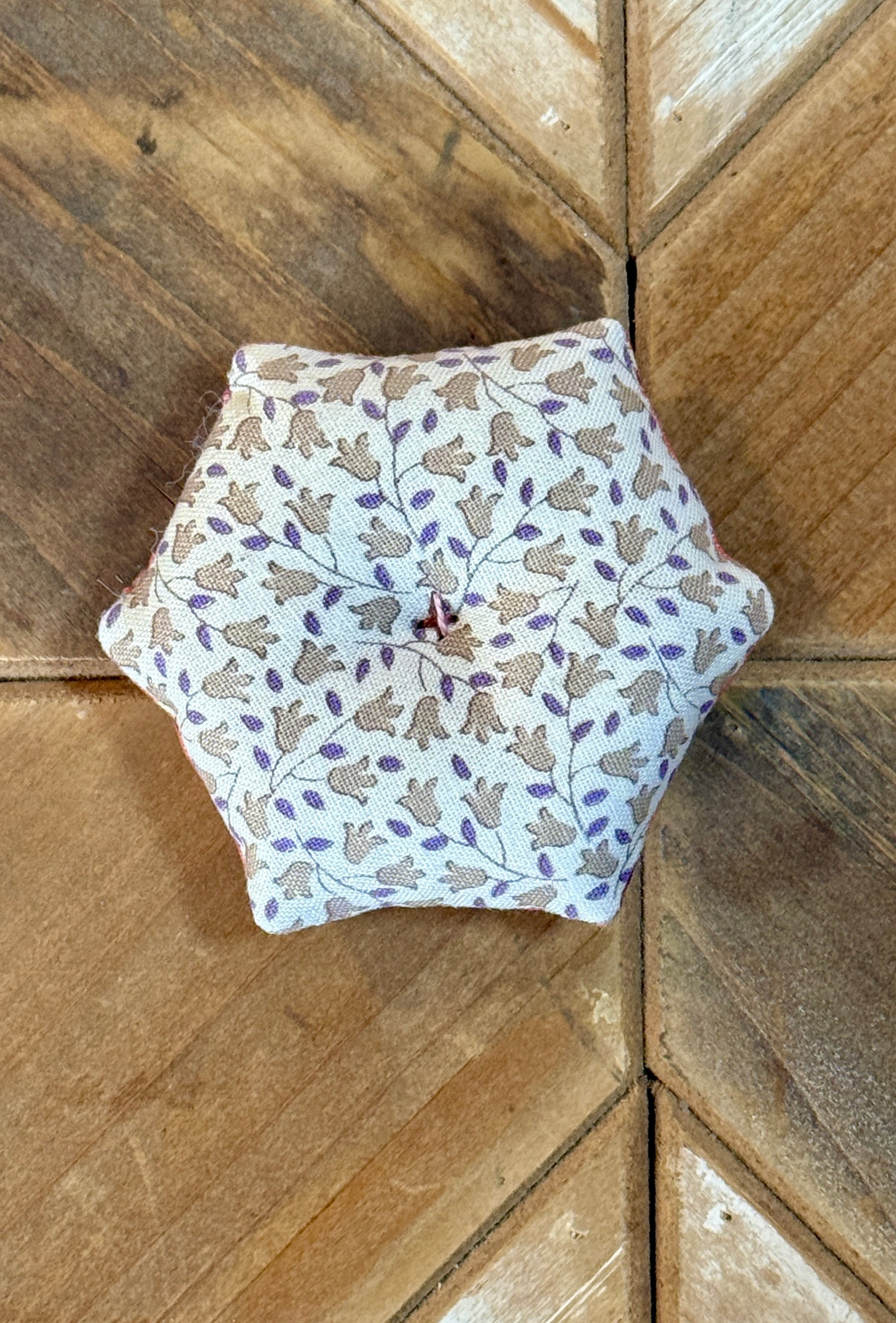 Hand-sewn with the traditional English paper piecing technique, this tiny pincushion brings handmade charm in a smaller size. Measuring about 2.25" x 3" x 0.75", it’s perfect for keeping pins and needles close at hand without taking up much space. The cushion is filled with polyester fiberfill and crushed walnut shells, giving it a nice balance of softness and weight so it stays steady while you sew. A button detail on the top and bottom finishes it off with a classic touch. A wonderful companion for hand-stitching, travel sewing kits, or as a sweet gift for a fellow maker!