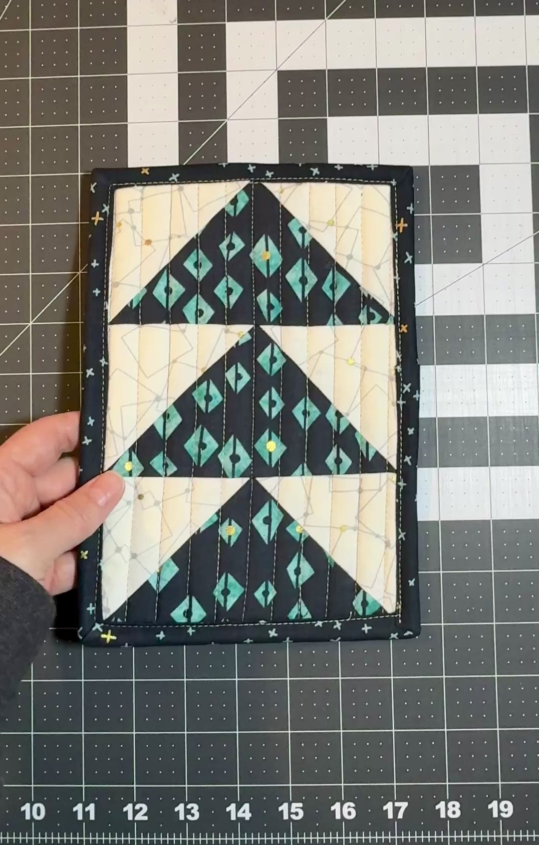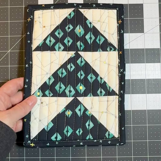 Enhance your coffee or tea drinking experience with a beautifully hand-crafted, functional art piece. This tea service mat or mug rug, machine-pieced and machine-quilted, functions like an extra long coaster. Crafted with cotton/polyester batting for durability, this one has an additional insulated batting layer for added heat resistance. Bring warmth, color, and texture to your dining area with this charming, one-of-a-kind accent. Measures approximately 6-1/4 x 9-1/4 inches.