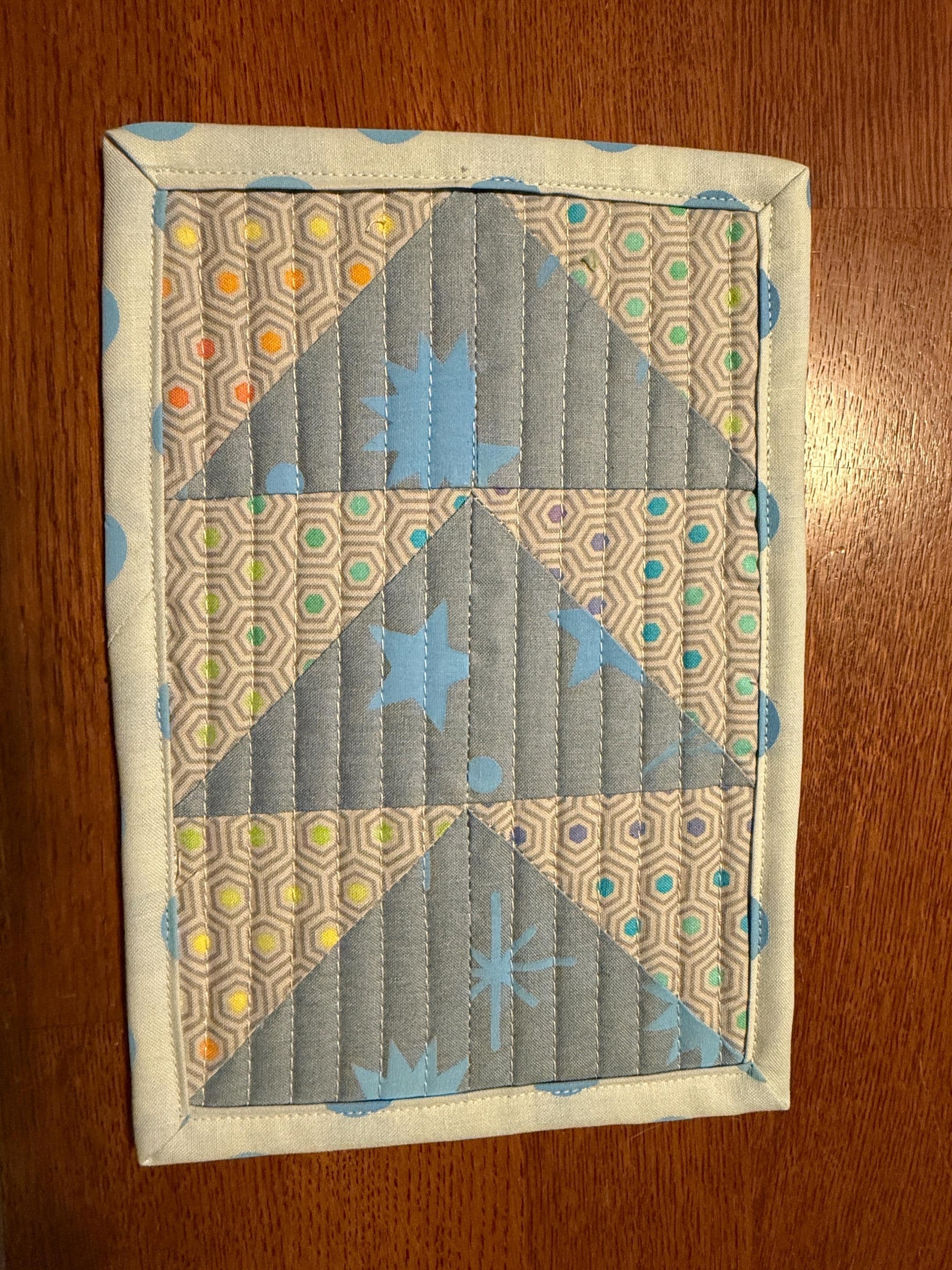 Enhance your coffee or tea drinking experience beautifully hand-crafted, functional art piece. This tea service mat or mug rug, machine-pieced and machine-quilted, functions like an extra long coaster. Crafted with cotton/polyester batting for durability, this quilt is designed for easy care - simply machine wash and tumble dry on low. Bring warmth, color, and texture to your dining area with this charming, one-of-a-kind accent. Measures approximately 6-1/4 x 9-1/4 inches.
